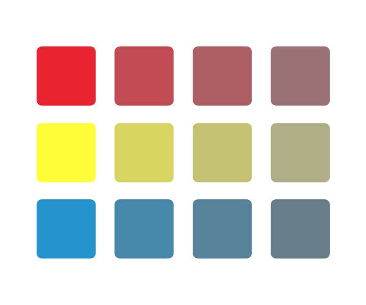 Tones are created by adding gray to a pure hue. The addition of gray slightly darkens the original color.