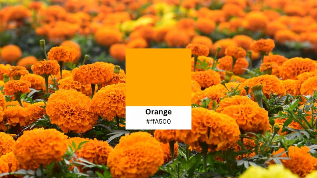 Orange is a vivid color formed by adding an equal measure of yellow to that of red: warm, vibrant, and alive. The hex code is #FFA500, and it represents warmth, excitement, and energy. It conjures thoughts of sunsets, tropical fruits, autumn leaves, and exciting summer days. Bright orange is a very noticeable color that is used commonly in warning symbols, safety equipment like life jackets, and even in astronaut suits made of plastic.