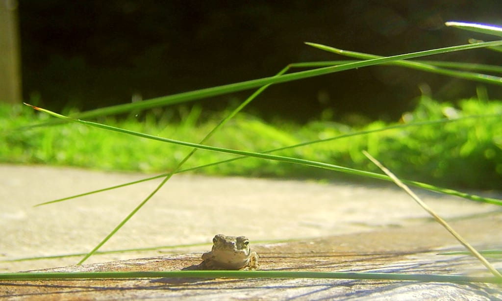 I slowly and steadily grabbed my camera and prepared myself for when whatever it was moving about to stop so I could capture a picture of it. I inched closer to get a better look and noticed it was a baby frog. Trying to contain my excitement I could feel a subtle grin creep along the side of my face. I got closer, knees to the ground type closer and placed my camera directly in the path of the young amphibian. I was expecting for the creature to get spooked and jump off but as the seconds ticked by I noticed this was a now or never situation.