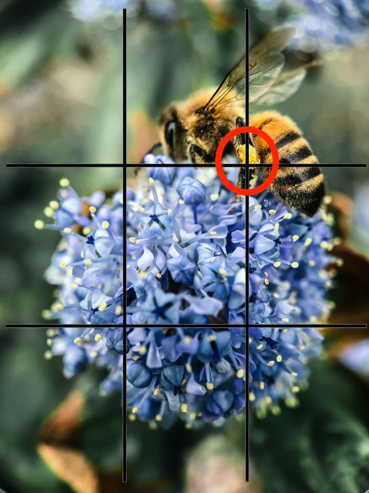 In traditional Rule of 3rds-style framing, the photographer places the subject on one of the four intersecting lines of the 3rds grid.