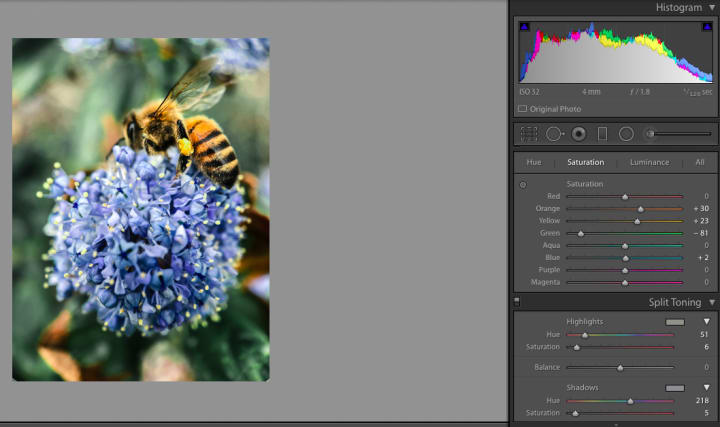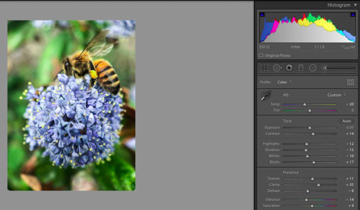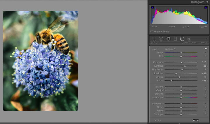Last but not least, we are going to apply some local adjustments exclusively to our primary subject: the pollen nugget. We want to make sure it's squarely the brightest part of the image without overdoing it. We are going to add a bit of exposure while bringing down the blacks and whites for a more moderate look.