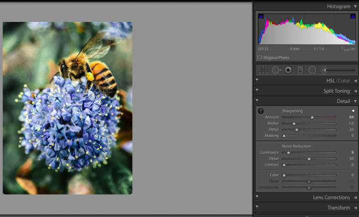 Then we are going to sharpen to make the textures of the flower stand out even more and add a slight vignette to center the viewer's focus.