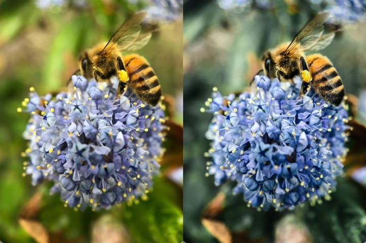 Next, we want to correct the colors. The most important thing we need to achieve here is making the background green tone much darker so it doesn't interfere with the lighter tones in the foreground. We also want to add some depth to our blues and yellows while shifting the yellow tone a bit closer to orange to contrast the light blue of the flower.