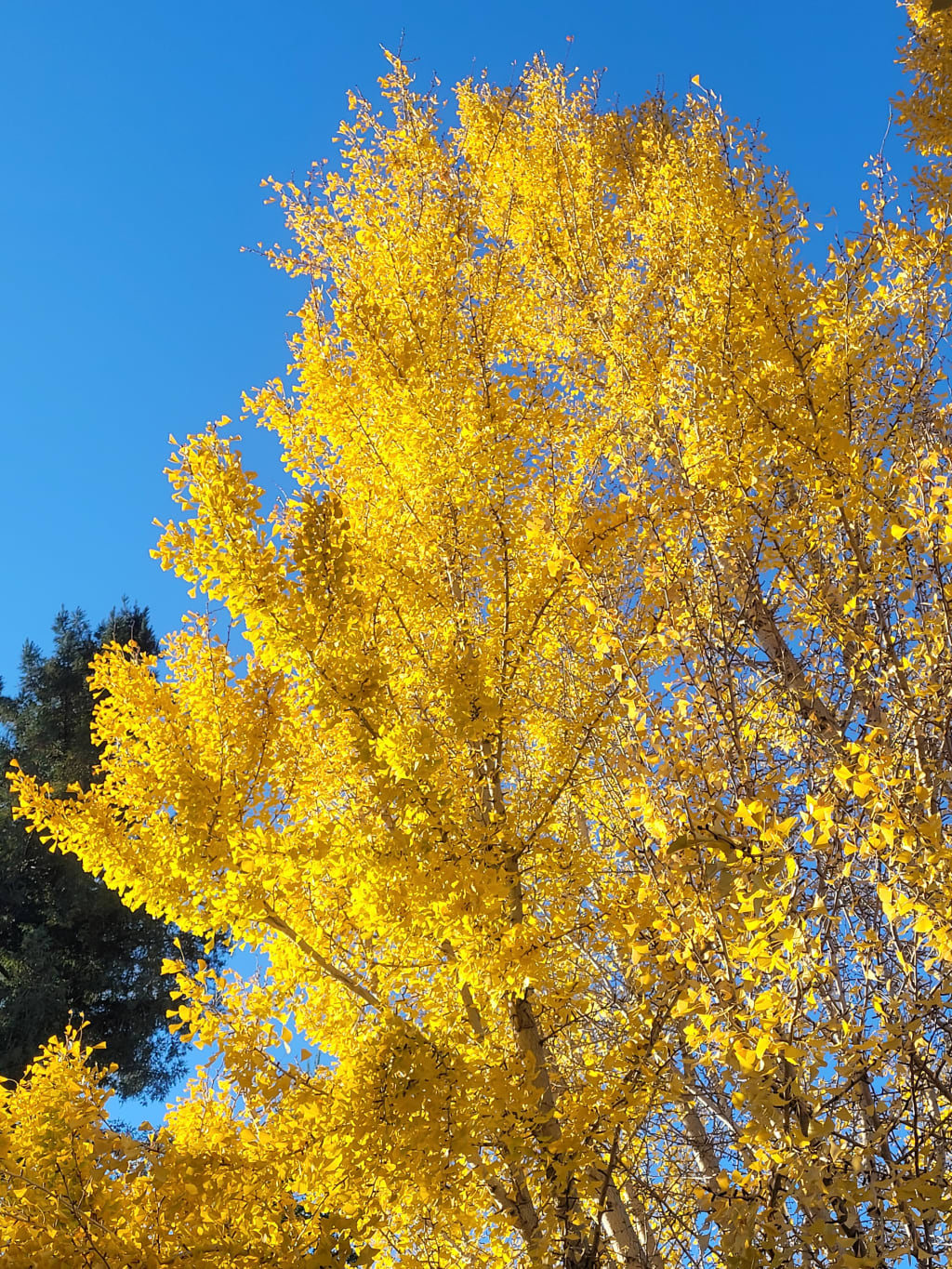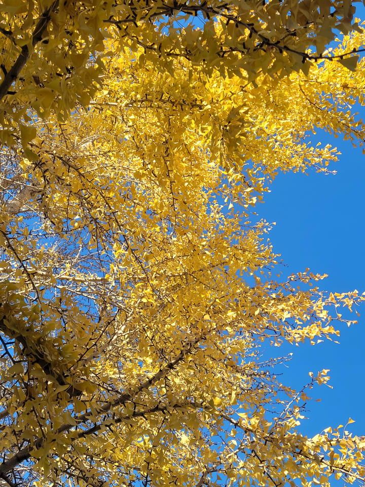 As I'm thinking this, a ginkgo leaf lands in my hand. Soft, substantive, weighted, and—unlike that familiar papery crunch of autumn leaves underfoot—so very alive.
