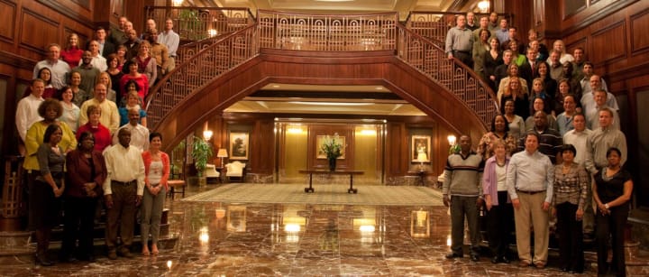Even if you are using strobes and a studio background, the ambient lighting can determine your exposure settings. In most of my shots, we were in a training room with fluorescents overhead, so I shot at the fastest sync speed. But some group shots were back-lit by a huge palladium window, so I used only essential strobes, dragged the shutter, and let the warm ambient light do its thing.