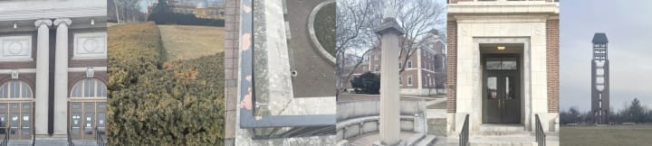 In order, the sites include Foellinger Auditorum, the Morrow Plots, the railing of the Undergraduate Library, the Eternal Flame and the South Bell Tower.