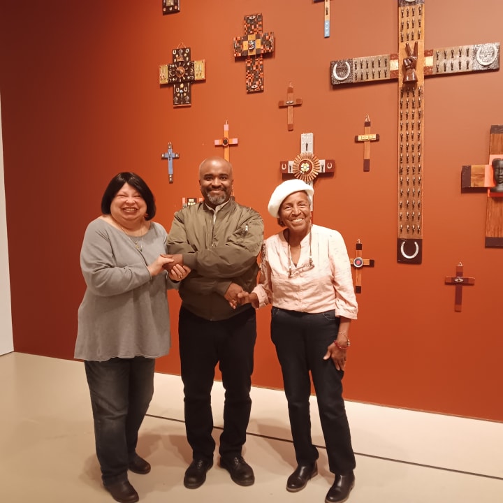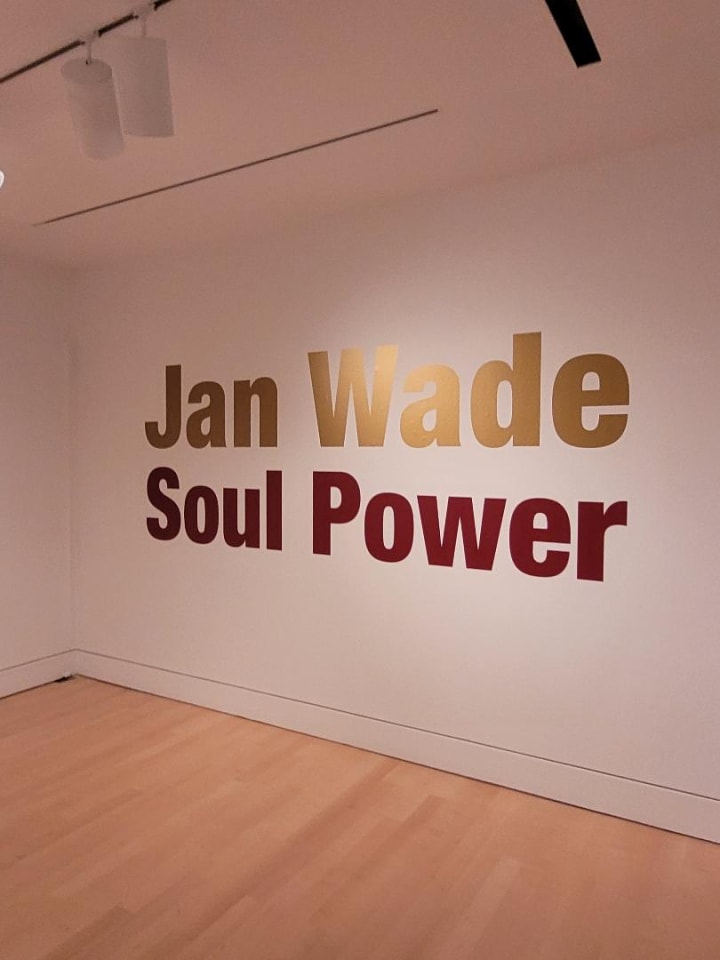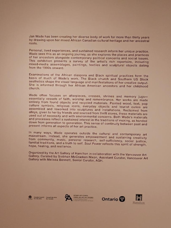 I walked into what turned out not to be the main entrance – I always seem to find the wrong way in with these displays – and I was in the hall of crosses. There were other art works around the room, but this was the exhibition that stood out to me. It was the part of her show that overwhelmed me as I felt the urge to both step forward and step back. You encounter one solid wall of crucifixes stamped and embossed with imagery and phrases from Black history: “Soul Power”; “Do the Right Thing”; “The Revolution Will Not Be Televised”, etc. I noted that the pieces used to affix the lines came from buttons, old, Scrabble and other games I used to play as a child. And I also noted that deep within my head, this was also stirring up some unpleasant feelings.