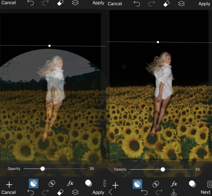 7. After the erasing process has finished. Turn the Opacity back to the level that you like. I always keep mine below 100 so that the two photos flow better together.