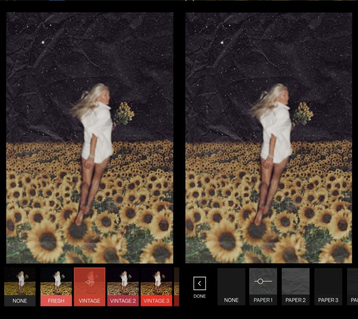 11. Once uploaded to Tezza. Click on the filter that best suits your photo. I used Vintage for this photo and turned it down to 45. Double tap the filter to turn it down. *It is important that you do not put a filter on any of the photos until this step to ensure that the whole photo is of the same quality.