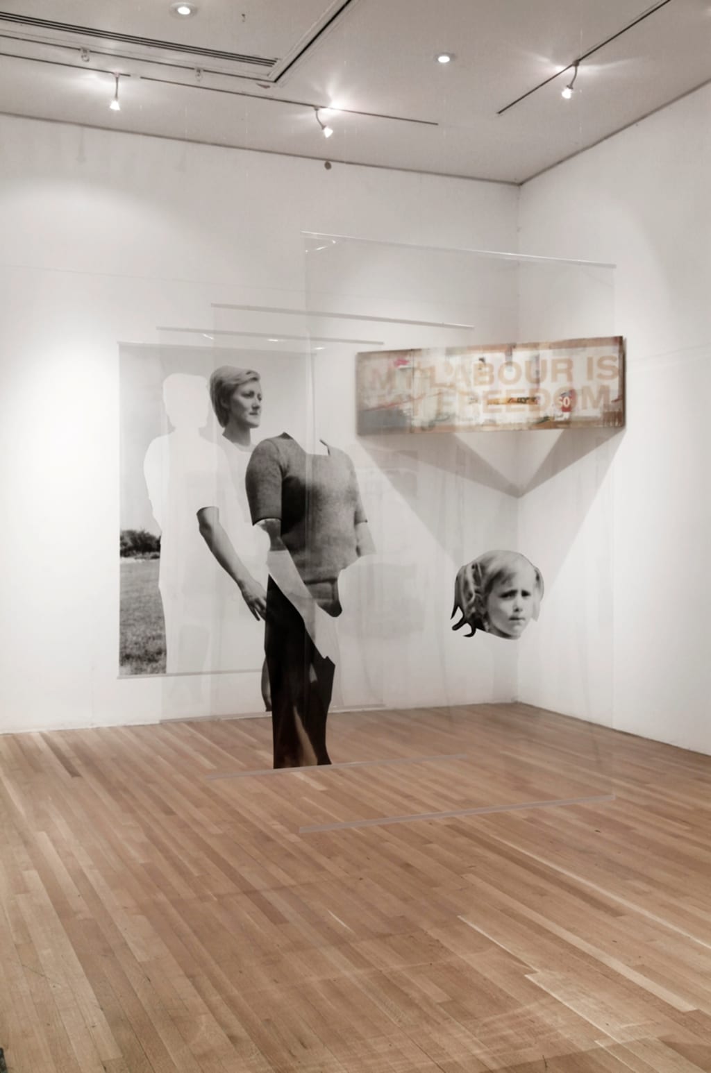 This piece fragments the image; it divides it into four layers, each of which is printed on to a life-size transparent sheet (see figures 2.1-2.4 and 2.5). Each sheet is installed as a fragment, hanging from the ceiling and three feet away from those either side of it/before and after. The entire work floats in the space it is installed in, and it allows the viewer to see it as four different fragments and/or as a coherent whole.