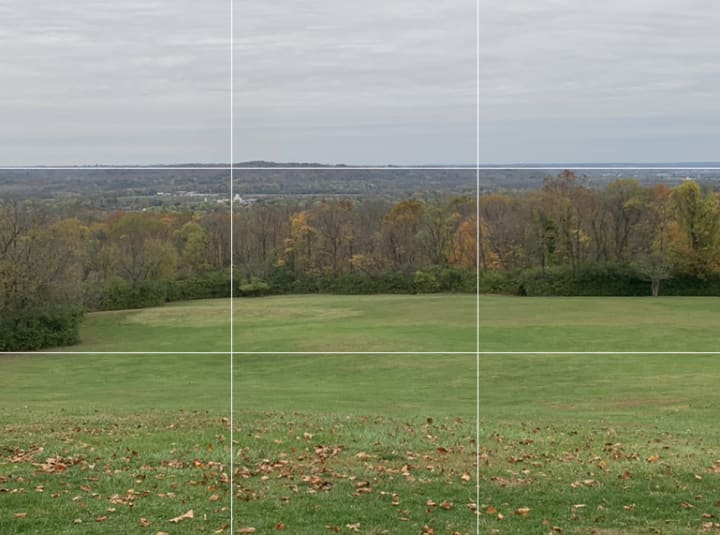 When composing a landscape, by placing the horizon line on one of the thirds you'll be able to show your audience what you want them to take notice of. In the image above, I placed the horizon on the lower third making the sky fill up most of the frame. Although this is a "well composed" image, placement wise, the content in the frame is a little boring. Most of the excitement is in the color of the trees.