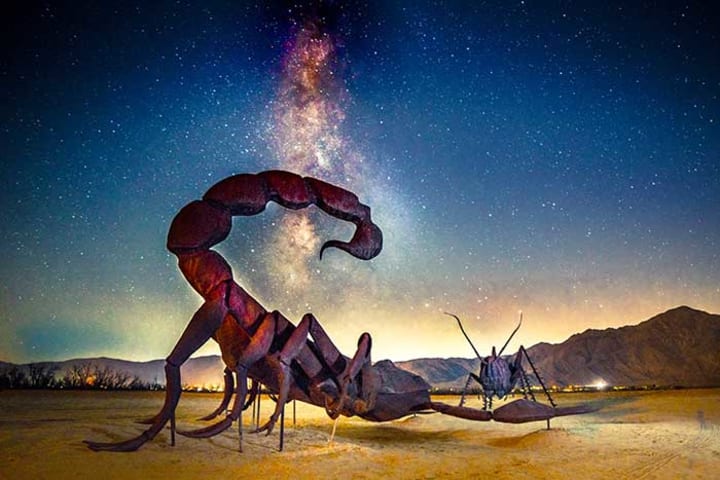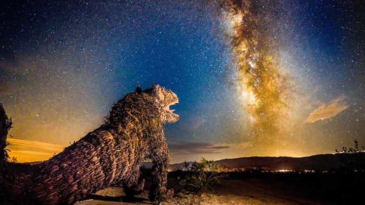 Arriving in Borrego Springs in the daytime is important. I have to scout the sculptures. There are over 130 statues to choose from, as this prolific artist is given free rein to populate Galleta Meadows with his welded statuary.