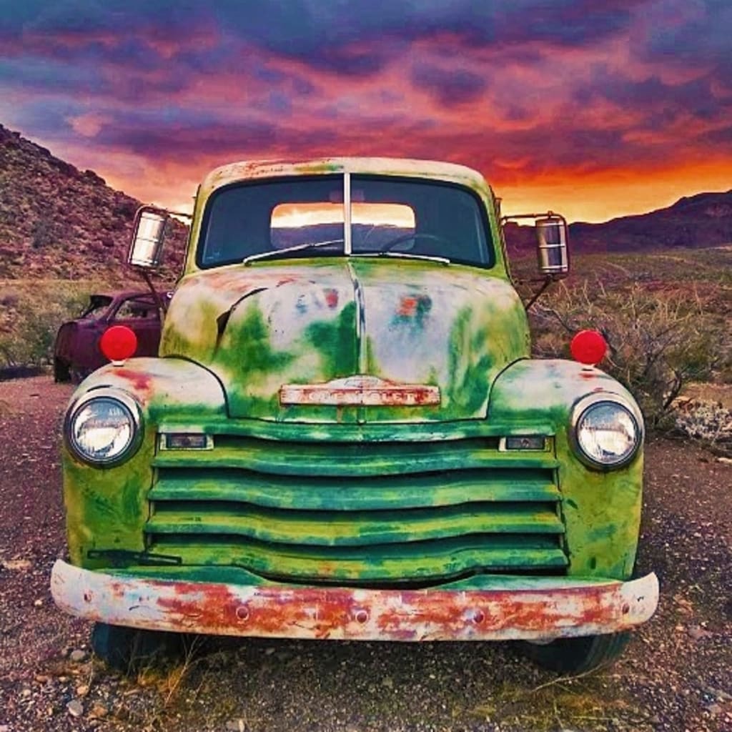 Heading West on a desolate stretch of aging Arizona asphalt, the famed Route 66 Museum known as Cool Spring's Station offers some unique sights and sounds for those who venture a visit, especially during the "golden hour", with this vintage American classic pickup standing proud against the brilliant kaleidoscope of colors from the Sun setting over the mountains in the background.