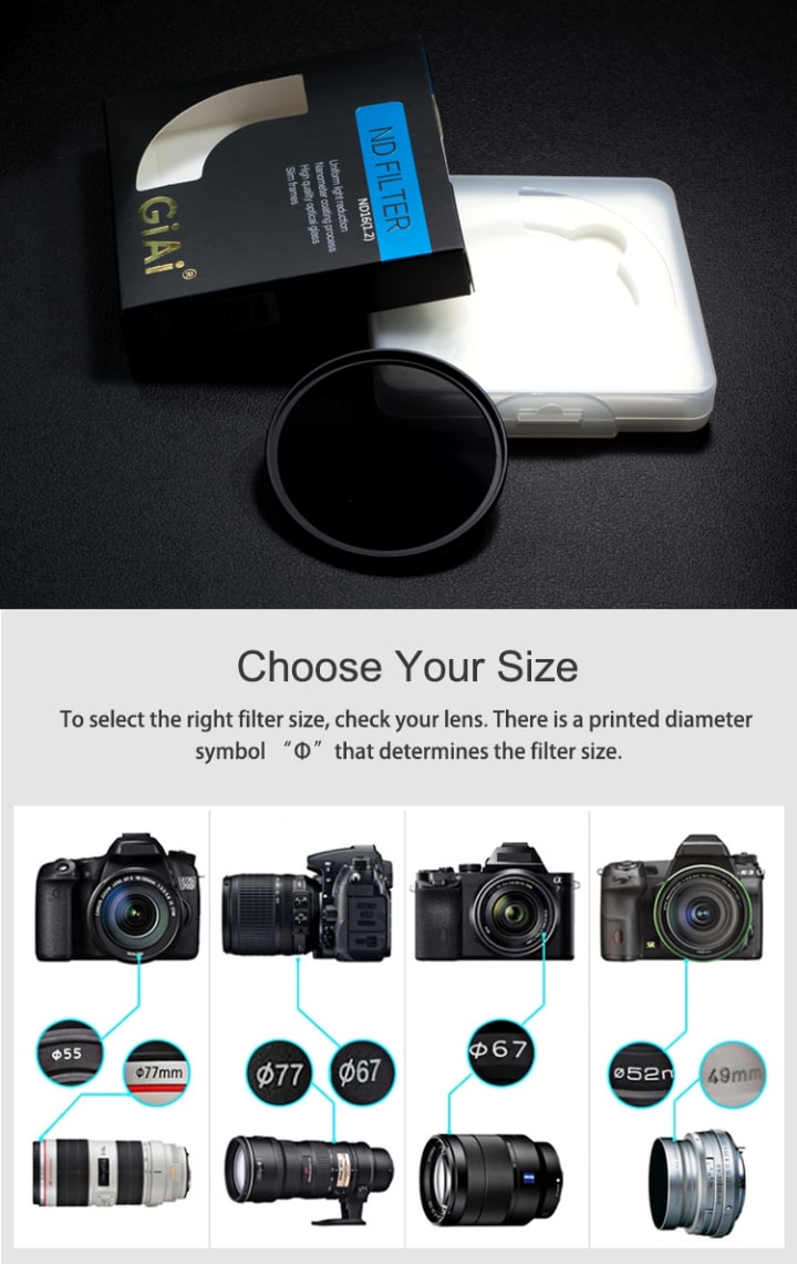 a.) Circular ND filters are designed to directly screw on to the front of lenses that have a screw thread. It is typically designed to fit a specific lens thread size ranging from 40.5mm all the way up to 95mm.