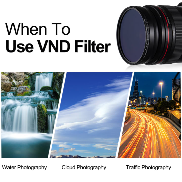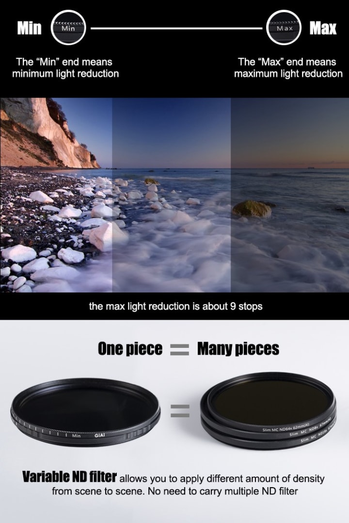 Advantage for moving photography, VND filters allows you to change light when you need to shoot fast. Unlike other ND filter, you don’t need to change it most of the time to adjust. Better for shooting videos.