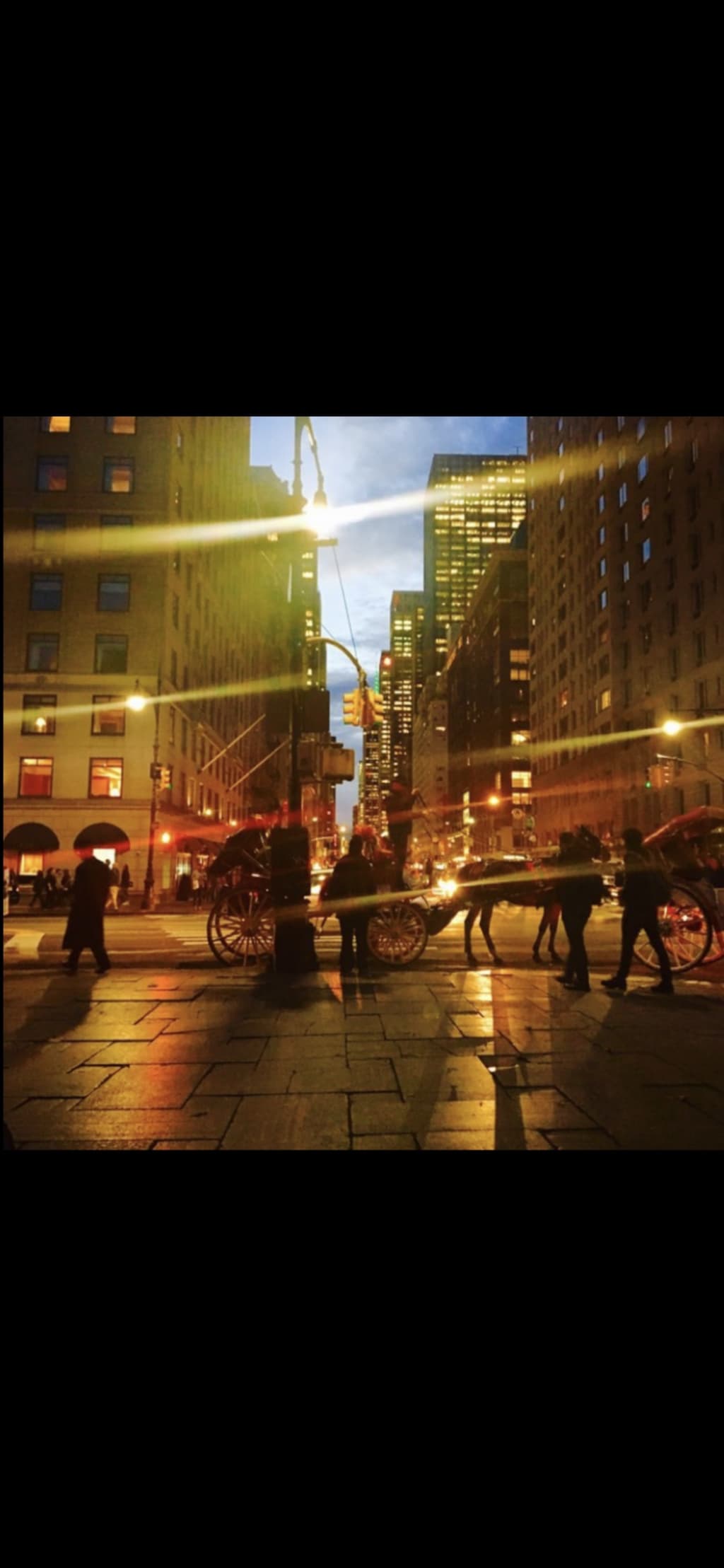 As it was starting to get dark and the horse and carriages were passing the traffic lights and street lights were casting a beautiful glow on the unfolding scene in front of me it reminded me of seeing a Broadway show and as the scene would change the setting of the stage and lights would make the appearance of a competely different stage.