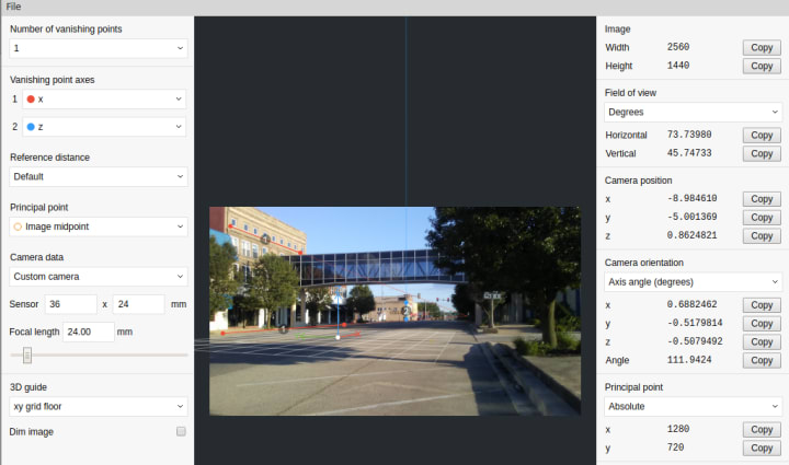 To line up the virtual camera with the real world camera, fSpy needs a few key data points from you. You load the image into fSpy and drag the points to establish the reference lines. You may wish to untick the "Dim image" box. I've no idea why this is the default, but it is. To fine tune your lines you simply hold the "Shift" key down to zoom in. While not entirely necessary, it's recommended to plug in your focal length as well. My example looks like: