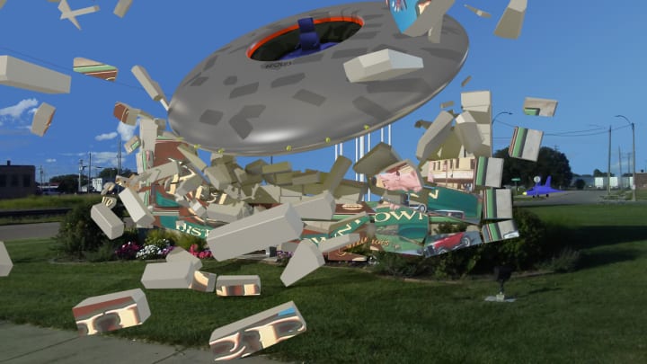 Once you get that down, there's no stopping you. Destroy a landmark? Sure. No problem. No grenade launcher desired or required. Using a few more tricks, including physics simulations, you can go all the way out of your head. Observe...