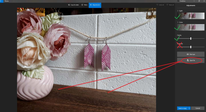 For the following earrings photos, I opened the photo in Microsoft Photos, cropped and straightened, and adjusted the light, color, and clarity. Most average phone photos need more light and more color saturation. I bump up the clarity to around 20 in almost every photo I edit because that's incredibly important for product photos. I also removed a few pieces of dust with Spot Fix. It took just a few minutes.
