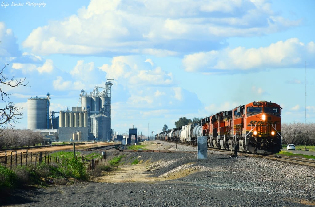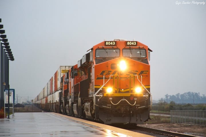 BNSF 8043 rushes through the rain with an intermodal passing Modesto.