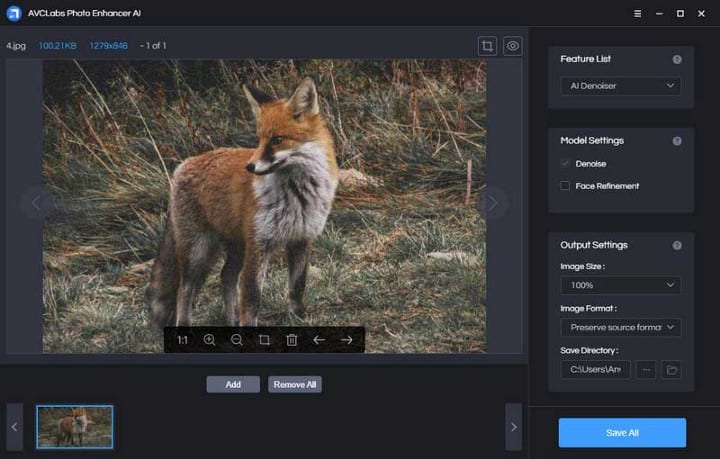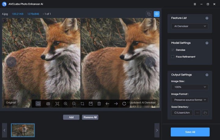 Select the corresponding “AI Denoise” model in the feature list according to this noisy fox photo. Then set the output size and directory.