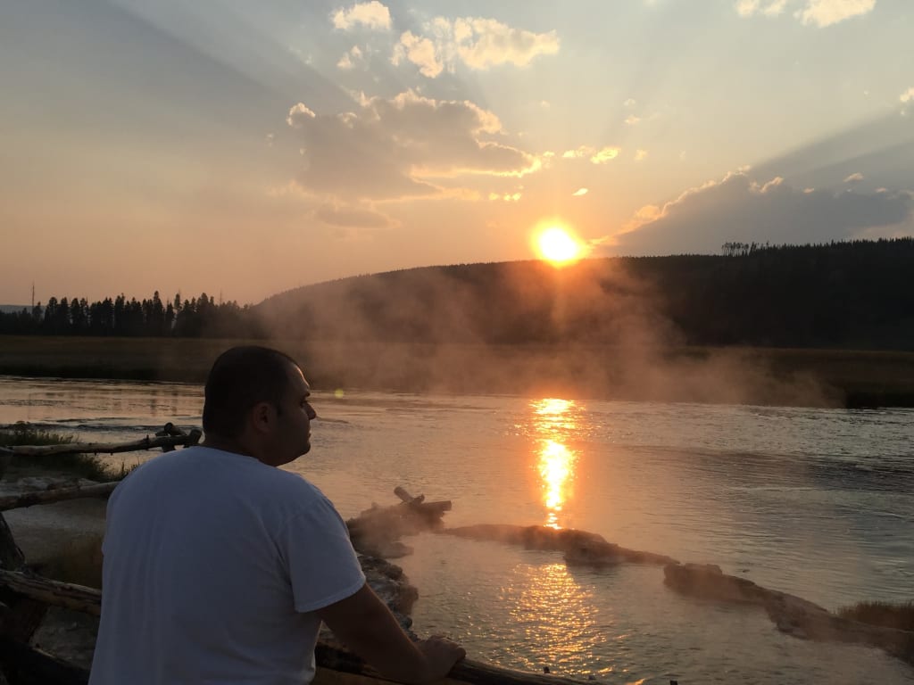 Right before our wedding anniversary, we decided to go Yellowstone and explore the amazing nature and wildlife there. We spontaneously booked a last minute trip from LA to Yellowstone. Getting there was challenging; we had to drive more than 50 miles in old roads to go from the airport to our the Mammoth Hotel and Cabins inside Yellowstone. After driving down from Bozeman, Montana, pass through Yellowstone’s Western Gate in late August, and park rangers in Smokey-the-Bear-style hats and khaki uniforms greet you with a map. On the way there, we were also greeted by a herd of bisons and elks. When we arrived at the hotel, it was end of sunset. We were a bit upset about not catching the sunset but decided to catch the sunrise early in the next morning. So, we went to bed very early that night.