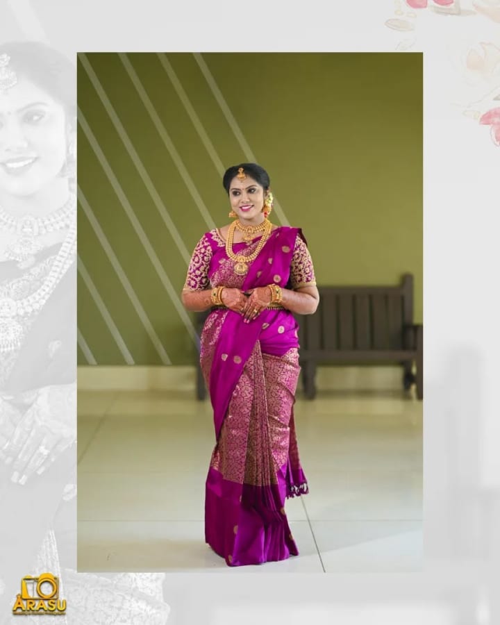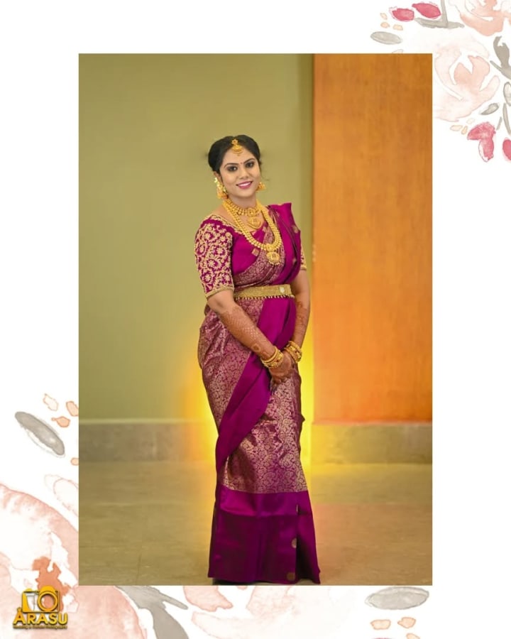 One of the most crucial aspects of a South Indian bridal photoshoot is the attire. The saree, often woven with intricate designs and rich colors, is the centerpiece of the bride’s look. At Arasu Studio, brides typically wear Kanjivaram sarees, which are famous for their elegance and historical significance.