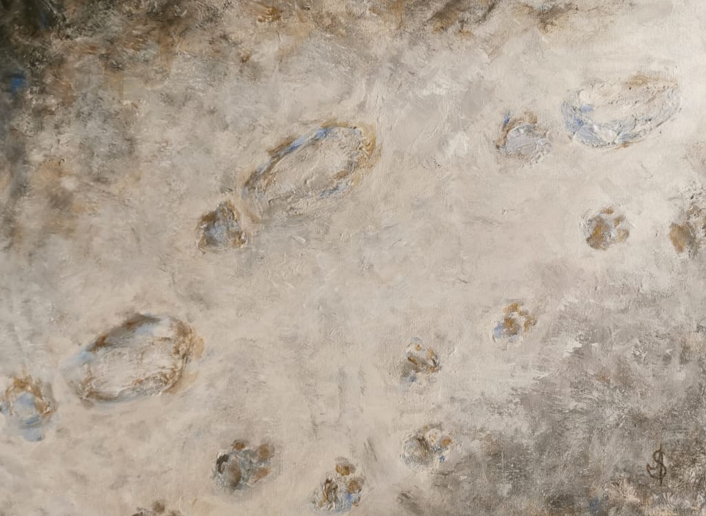 I work at La Maison des Artistes. It vibes quite the good flow here: I look to the left and find an old photograph, I look to the right and find a collection of paintbrushes, down over there I see footprints, and up over here I see a shimmering light. With the tips of my fingers, I caress the woodgrain of my dresser. At first I’m reading braille and then it gets weaved with numbers, and equals, and divisions. My hand passes through its mathematics; the X marks the spot.