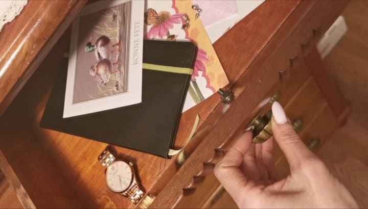 I delicately open the old drawer of an even older dresser. I hear the tic-tac but the bells didn’t ring yet. To my great astonishment, what do I see!? It is a black little notebook. Inside, I find a tiny envelop with the scribbles of my name on it. I opened the little envelop and to my great surprise what do I find: twenty-thousand-dollars! I hit it twice in a row! It’s good fortune. Luck shines upon us; it’s rather a blessing than luck.