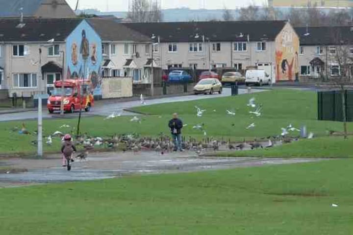The Locals have no interest in harming their visitors who bring them so much wonder and enjoyment, not even at Christmas when a goose would make a tasty Christmas dinner for a change, no, the people of the Lower Shankill Estate, Belfast, Northern Ireland just enjoy their winter friends for company, especially the children.