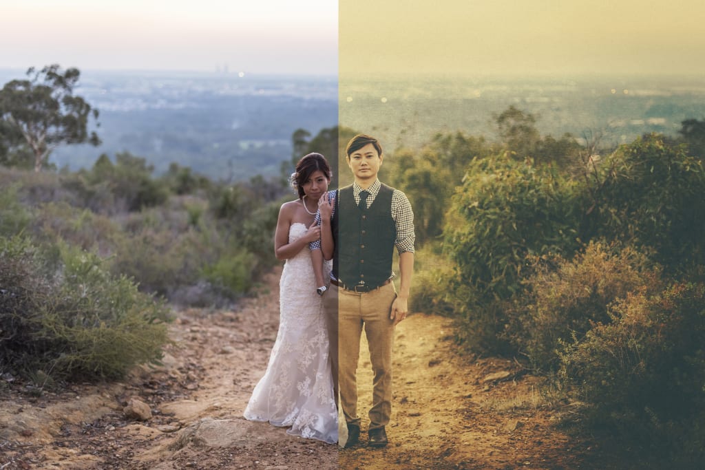 I used the adjustment brush in Lightroom to pull the exposure down and saturation up for all the areas around the couple, without brushing over them directly. Better, but not done. It didn't yet feel like the vintage whimsy that was in my head. Onwards then.
