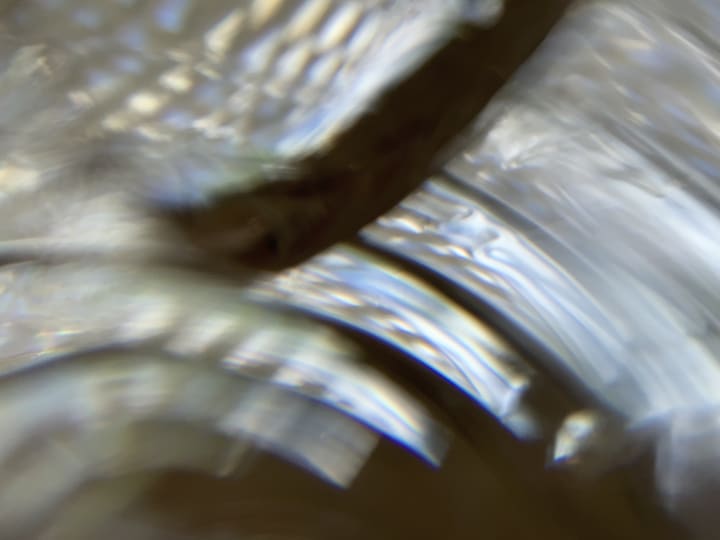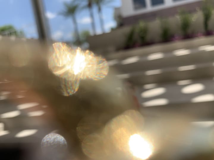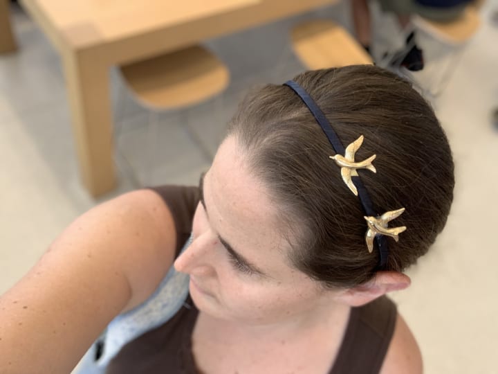 Finally, my most memorable decisive moment was coming up, but not without its own unique challenges. The small size of the headband and golden dove pendant made it difficult for my unsteady hand to hold the object steady in front of the iPhone lens while I framed a shot I liked. Furthermore, I had to hold it steady under one of the cones of sunlight shining through the awning above. Together these tasks made quite the obstacle challenge!