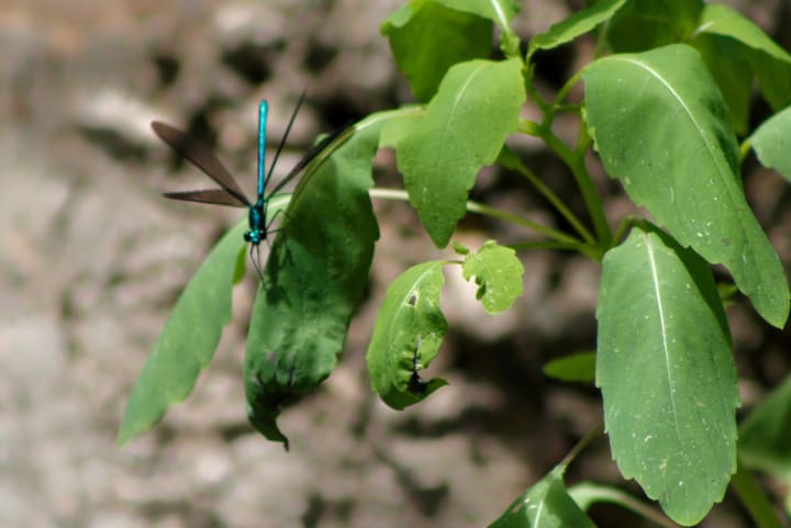 Ebony Jewelwing with it's wings slightly clearer. It's striking blue spreads even to its wings.