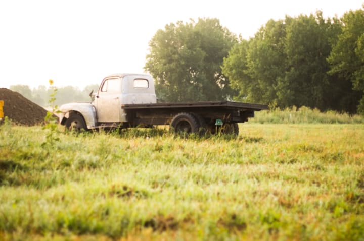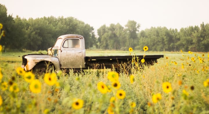 Now let’s try backing up. It requires some shuffling and awkward body positions, but we’re not afraid to be that photographer, you know, the one straddling the ladder or sprawled on the ground all for the sake of a better shot. Remember the weeds we noticed? Well, it turns out that the tallest ones are wild sunflowers. If we stand at just the right angle and find the perfect crop, we can miss the dumpsters, equipment, and most of the random turkeys, giving the viewer a little piece of magic. The photo has a dense foreground, meaning that there are quite a few obstacles between photographer and subject, but it’s the best whole-truck shot so far:
