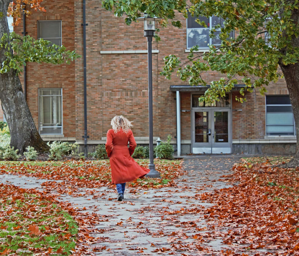 Metaphorically speaking, the blustery day and the fallen leaves she is passing through represents the current turmoil in her life. The split path represents the personal journey she is on. The doors to the right represent the main stream medical establishment. The left, the one she has chosen leads her into an unknown future.