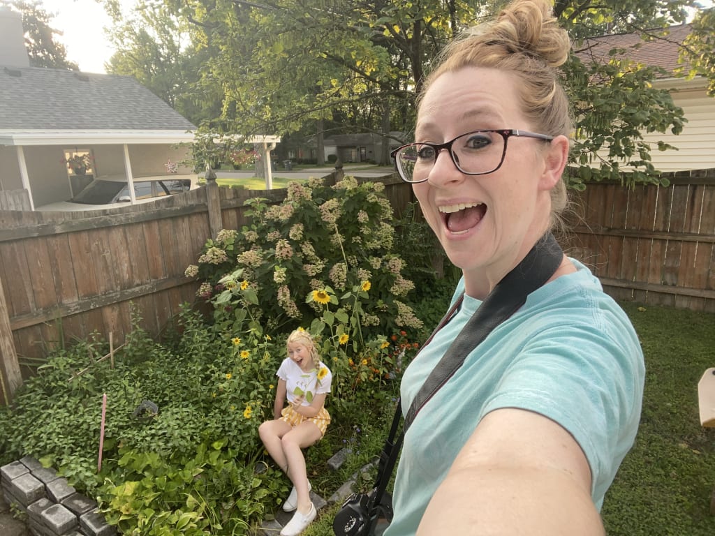 Me, standing on a wobbly 3-step ladder, in my backyard, with my daughter & our MAYBE 18-24 sunflowers 🌻