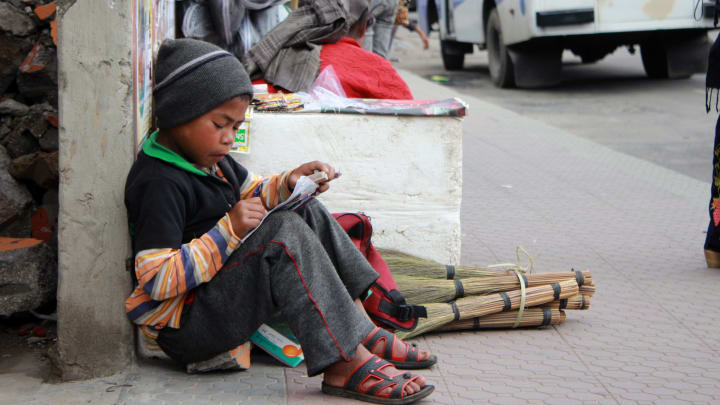 I always walked around the streets with my camera when I was in college in Shillong. During one of those days, I was out with my girlfriend when I chanced upon this little boy attentively doing his homework while looking after his mother's stall by the footpath. I sat there observing the boy for a few moments after taking the photograph and the little boy was so engrossed in his work that he hardly noticed me or the crowd that went by him.