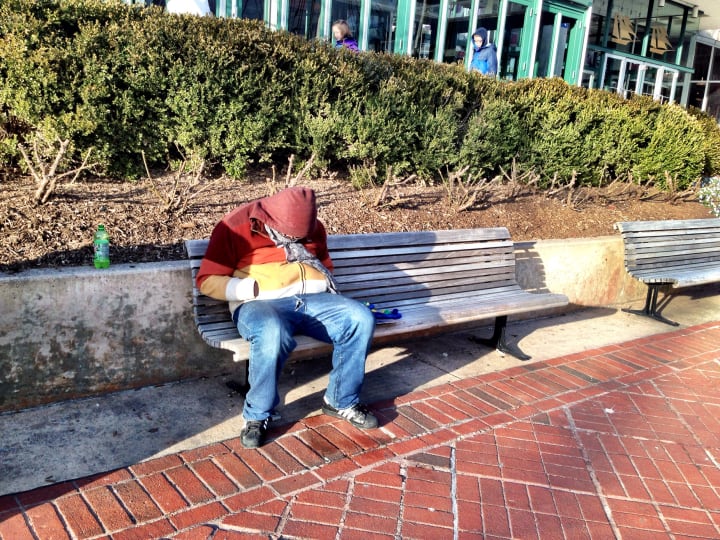 As I was walking in between the pavilions at Harbor Place, I saw a homeless man sitting on a bench. He appeared to be sleeping and trying to keep warm out in the cold conditions. So, in the midst of the hustle and bustle of a busy work day lunch break downtown, here was a homeless person sleeping on a bench.