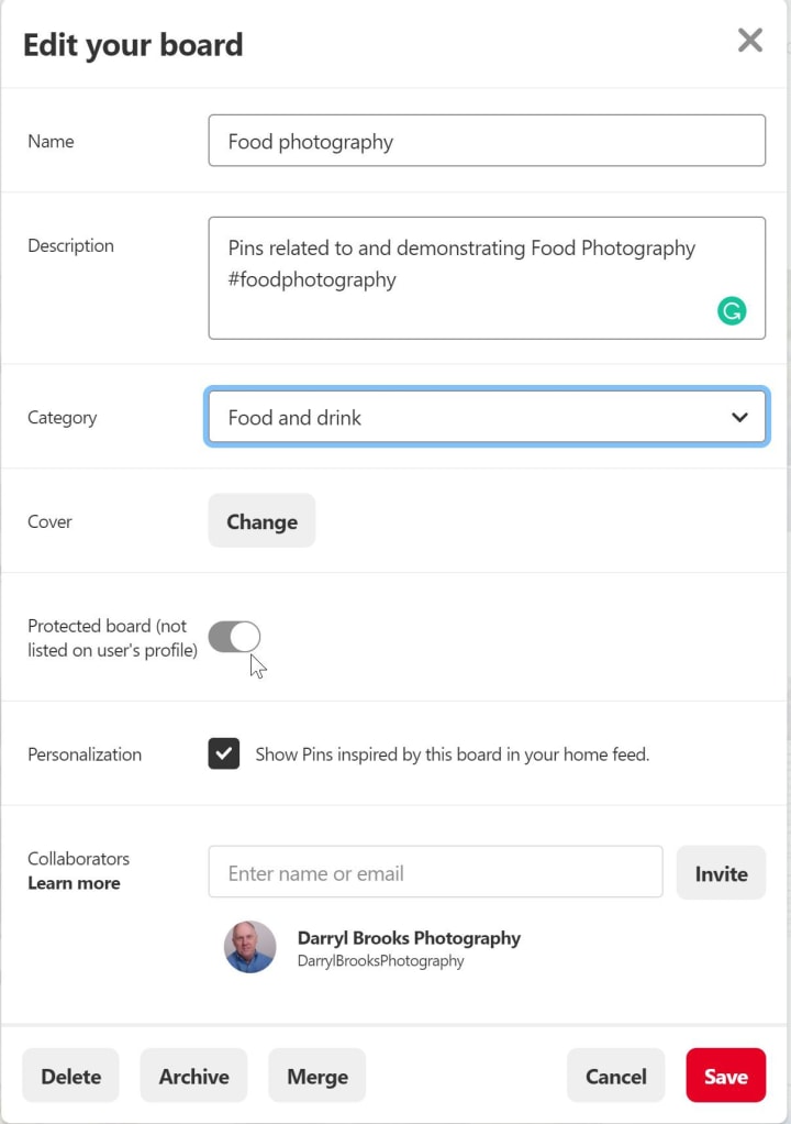 One last tip on boards. If you click on the Edit pencil on any board, you see an option for Protected Board. Check this to keep it private. This will make it invisible to other people on Pinterest. Hidden boards are a great place to keep pins you are researching or pins that you are working on, but may not be ready for prime time.