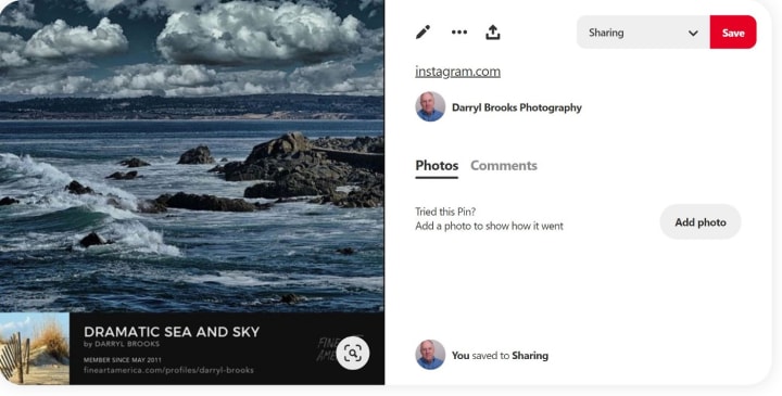 Many image-hosting or POD sites have built-in links to post your content directly to Pinterest. This will create a ready-made pin with ready to post.
