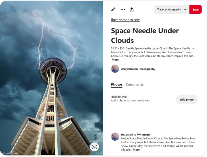 This pin, which I created from an image of Seattle’s iconic Space Needle, continues to get me the most traction today. It has a compelling image and a good description. But the main point is other pinners save it on their Seattle boards. So it is not only seen and clickable by my followers but also all of theirs.