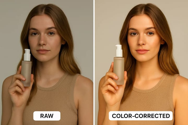 Color correction is the process of fixing lighting, white balance, contrast, and color issues in a photo. It ensures your images look natural, polished, and brand-ready. Learn more about the technical aspects of color correction on Wikipedia.