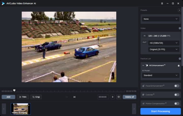 To address various quality concerns, it offers four distinct AI features: AI Enhancement, Face Enhancement, Colorize, and Motion Compensation. When dealing with shaky videos, turning on AI Enhancement is essential. For the situation where facial details are blurred, it is recommended to turn on Face enhancement, because it can effectively restore the clarity of blurred images.