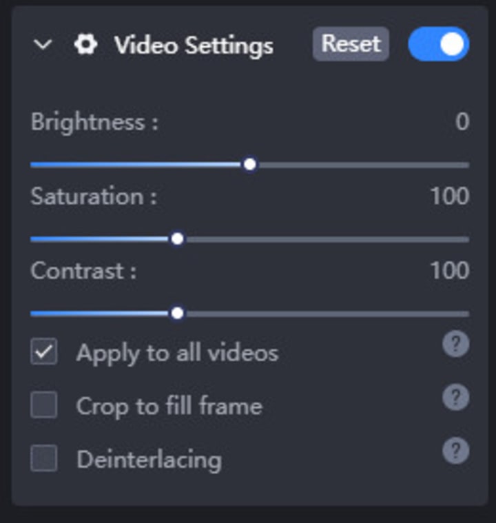 In the Video Settings part, you can manually adjust the brightness, contrast, and saturation of the video to fine-tune the color.