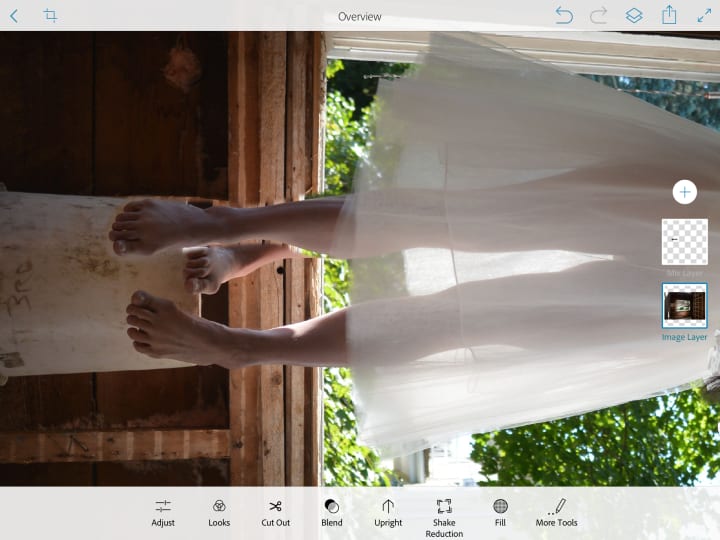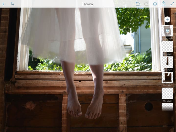 Okay! First things first, I had a vision and it did not involve a bucket! I’m going to use Photoshop Mix for mobile to remove the bucket and fix the foot that’s standing on the bucket. To do this, I have another photo with the opposite foot flexed which I will use to replace my standing foot. To remove the bucket, I have a photo of the background wall sans bucket that I will use to cover it up! These are issues I anticipated during the photo session so I would be prepared when it came time to edit. Sometimes we don’t always think ahead though, and that’s okay, you can still use the techniques I’ll be talking about, you’ll just have to be more flexible.