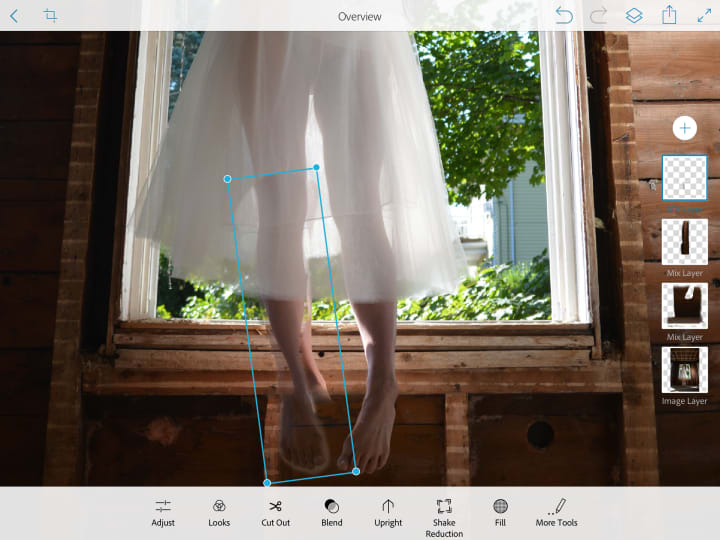 Let’s get this leg where it belongs! Load both photos into Photoshop Mix (or the editing program of your choice. You could honestly do all of this in Procreate or any digital painting software. You could even use MS Paint if you have a very steady hand and a lot of patience). Put the photo with the replacement leg on the higher layer so it will be seen on top of the main photo. Now use the “Cut Out” tool (or the selection tool in another program) to cut out the leg.