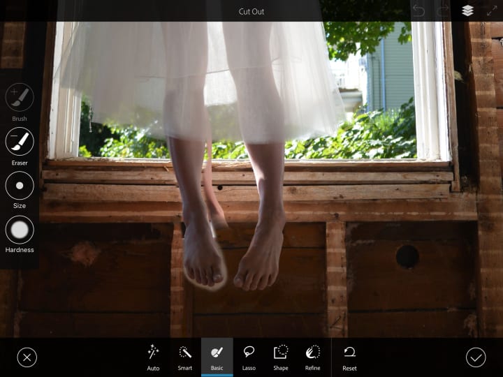 Now that the leg is the right size and aligned, we can refine the edges and make sure it blends into the rest of the image! Bring that opacity back to 100% and, using the skills I mentioned above, cut out the excess around the leg and foot until it blends seamlessly into the background. I found that with Photoshop Mix, the “feather edge” tool under “refine” was too powerful. I used the “basic” tool on a small brush size with hardness at 0 to get precise, soft edges.