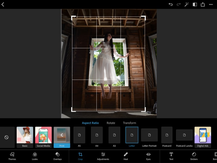 Now to crop the photo, utilize the handy dandy grid to best compliment your subject. In this case, I want the window to be centered and the model to be fairly centered along with it. If your subject is not centered, follow the “rule of thirds” to obtain a visually compelling composition! I moved the photo into Photoshop Express, but you can crop the photo in any photo editing app.