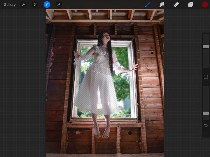 So you took some pictures and they’re perfect! brilliant! visionary!… or the idea was at least. Well don’t worry, you’re not done yet! In fact, I would say, you’ve only just begun! Look at the photo below (don’t strain your neck). There’s a concept behind it: a haunting figure floating in through the window, captivating yet foreboding. There are a few flaws that we can catch right off the bat (besides, of course, the roatation). The model (who is definitely not me) is on a bucket, for starters. The camera bag is in frame (whoops), and the backlight from the window has put the model in shadow; her head is hardly discernible from the background. But that’s okay! No need to start over, we can fix it in post!