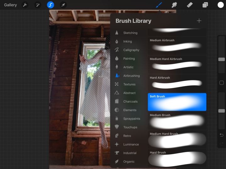 So how do I make her glow? This is where you’re going to summon your inner painter. It’s okay if you’ve never painted before, the selection area will do the hard work for you! Create a new empty layer. Go to the brush tool and select the softest brush you’ve got. In Procreate, go to “airbrushing” and select “soft brush.” If you’re on another painting program, turn your brush hardness to zero. Make your brush fairly large. In this case, make the diameter about a third of the photo’s width. It seems huge but because the brush is so soft, only a small area of the brush will be colored. Turn the opacity down to about half. I find it’s much easier to work with a large, soft, translucent brush when editing than it is to work with a more precise, more opaque brush.
